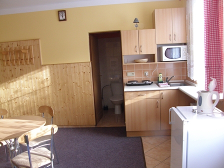 každý apartmán je vybaven kuchyňským koutem s lednicí, dvouplotýnkou, rychlovaznou konvicí, mikrovlnou troubou, základním nádobím. Apartmány vybaveny soc. zařízením s WC a sprchovým koutem, Tv+Sat, WiFi. Příjezd 14.00-20.00