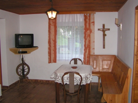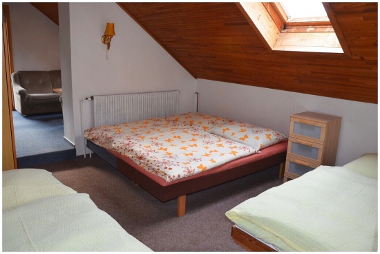 apartmán v přízemí - vlastní vchod, velká koupelna se sprchovým koutem a WC, společenská místnost s krbem, kuchyňka, 2 ložnice (pro 4 + 2 osoby). Apartmán v patře - společenská místnost s kuchyňkou, sprcha a WC, 3 ložnice (pro 4 + 4 + 2 osoby), balkon.