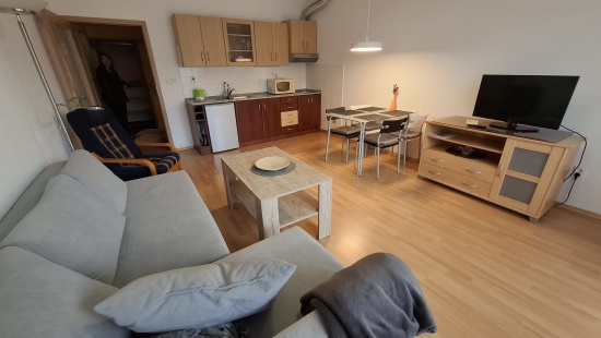 součástí apartmánu je kuchyňka s ledničkou, mikrovlnou troubou, dvouplotýnkovým vařičem, toustovačem a varnou konvicí, v blízkém okolí je možnost návštěvy restauračních zařízení různých cenových skupin