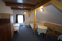dvoulůžkové až šestilůžkové pokoje vybavené teplou a studenou vodou, sociální zařízení ( WC + sprcha ) jsou společné na patře