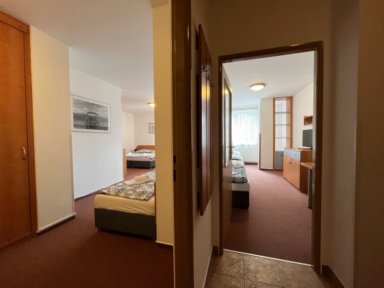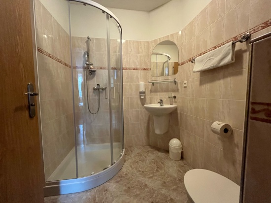 dvoulůžkové pokoje se sprchou + WC, SAT-TV, třílůžkové pokoje se sprchou + WC, SAT-TV, rodinné pokoje (2 ložnice, 1 společná koupelna, SAT-TV