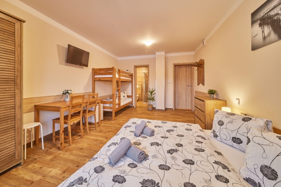dvoulůžkové, třílůžkové a čtyř lůžkové pokoje bez možnosti přistýlek jsou vybaveny koupelnami a WC, barevnými LCD televizory se satelitem, WiFi a ledničkami, většina pokojů je s balkónem