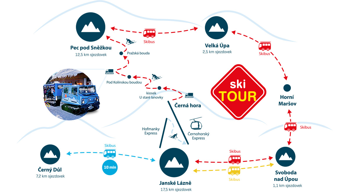 - SkiTour - rychlejší propojení areálů na lyžích, rolbou a skibusy