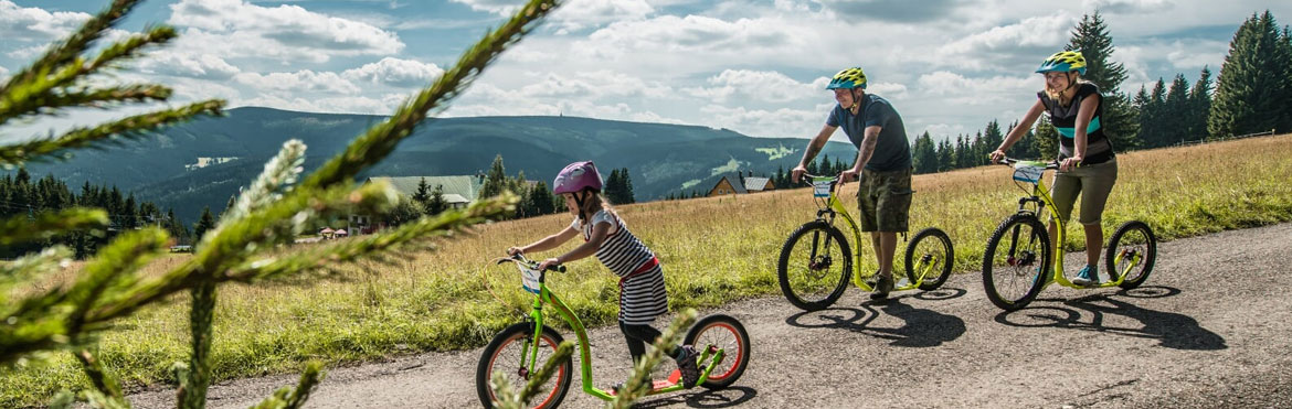 Erleben Sie Adrenalin, Aussichten und Spaß. Fahren Sie von Černá hora nach Janské Lázně mit einem Roller ab. Sie können sich auf eine 8 km lange Abfahrt mit neuen Geländerollern CRUSSIS mit leistungsfähigen Scheibenbremsen freuen. Es gibt zwei Strecken. Die erste Strecke folgt die Černohorská Straße, überquert die Pisten und endet am Parkplatz an der Talstation der Seilbahn. Die zweite Strecke führt zum Aussichtspunkt Modré kameny und zurück na Janské Lázně fahren Sie um die Kneipe Hospůdka na Formánkách herum, in der Nähe des Parkplatzes Lesní Dům. Der Parkplatz der Seilbahn ist ungefähr 1 km der Straße entlang entfernt.