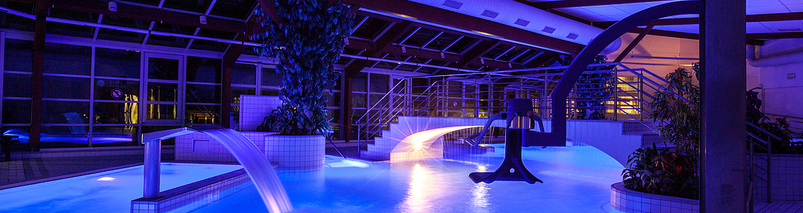 The pool also includes water curtains, underwater volcanoes, counter-current stream, massage and bubble beds, and indoor and outdoor hot tubs. Relaxing music and colorful underwater lighting helps to reate a pleasant atmosphere in the thermal pool.