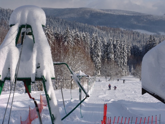 in a calm part of Janské Lázně , at the root of Černá hora . Near to the ski lifts and cross country skiing tracks ( nearest ski lift is just 100 m far away ).